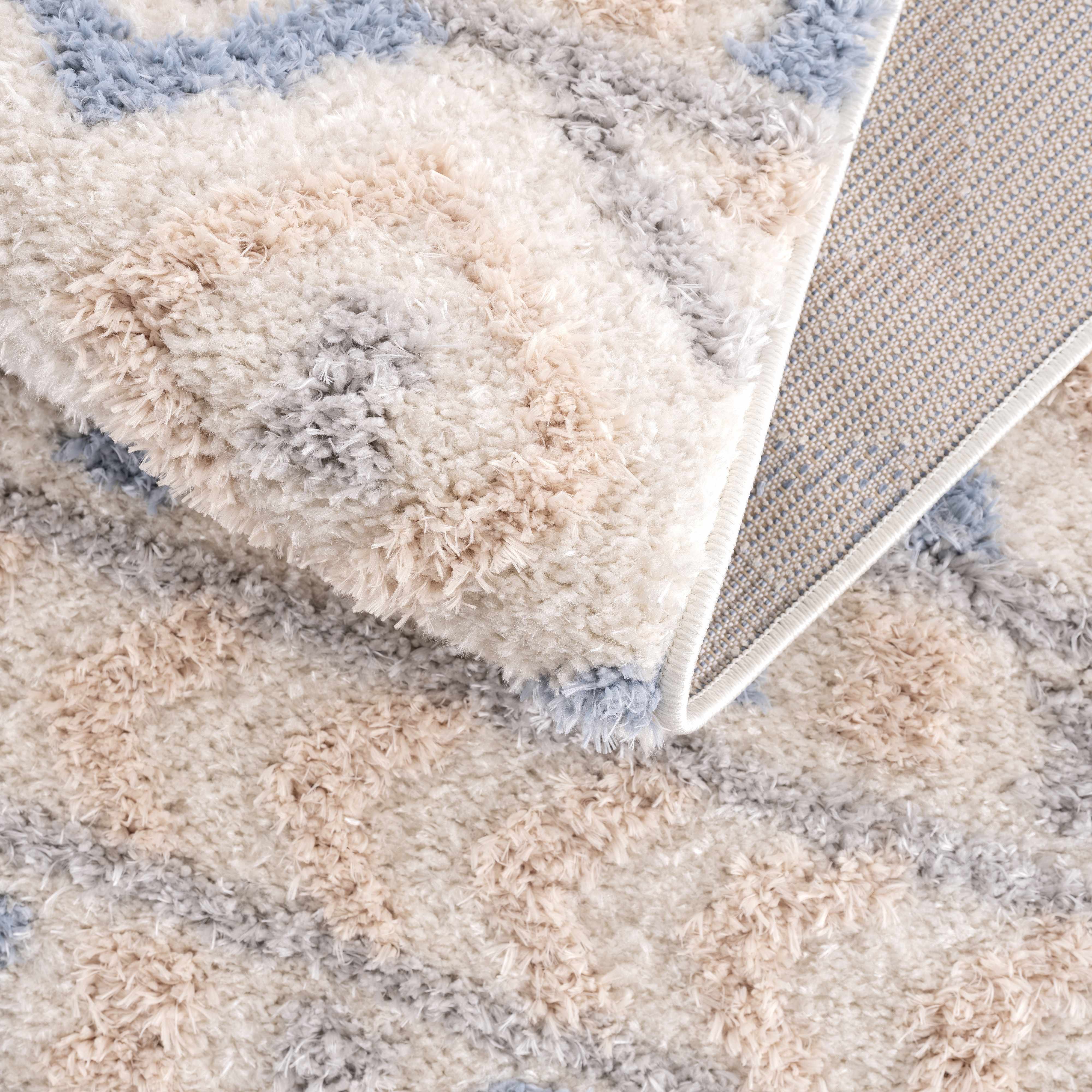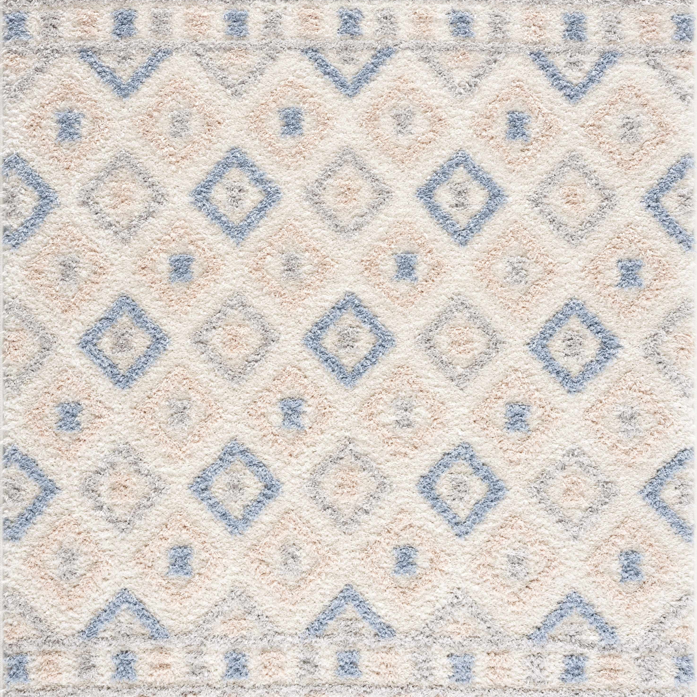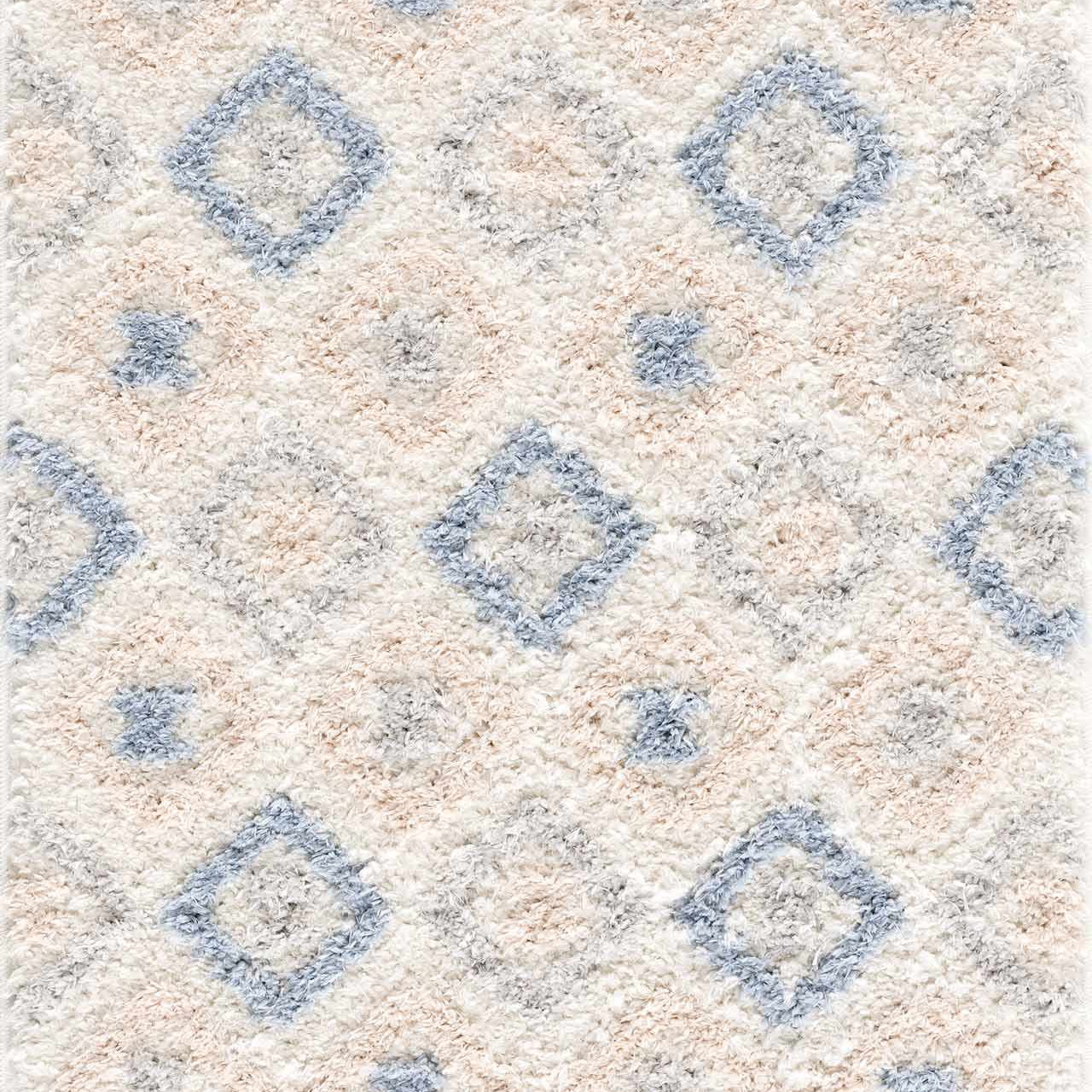 About: The Eivin Pink & Blue Area Rug boasts elegant diamond patterns in plush pile, combining Moroccan and geometric design influences. The beige background highlights soft blue and cream tones, offering a soothing, stylish aesthetic. Its plush texture ensures a soft and luxurious feel underfoot, making it perfect for enhancing any space with both comfort and elegance.