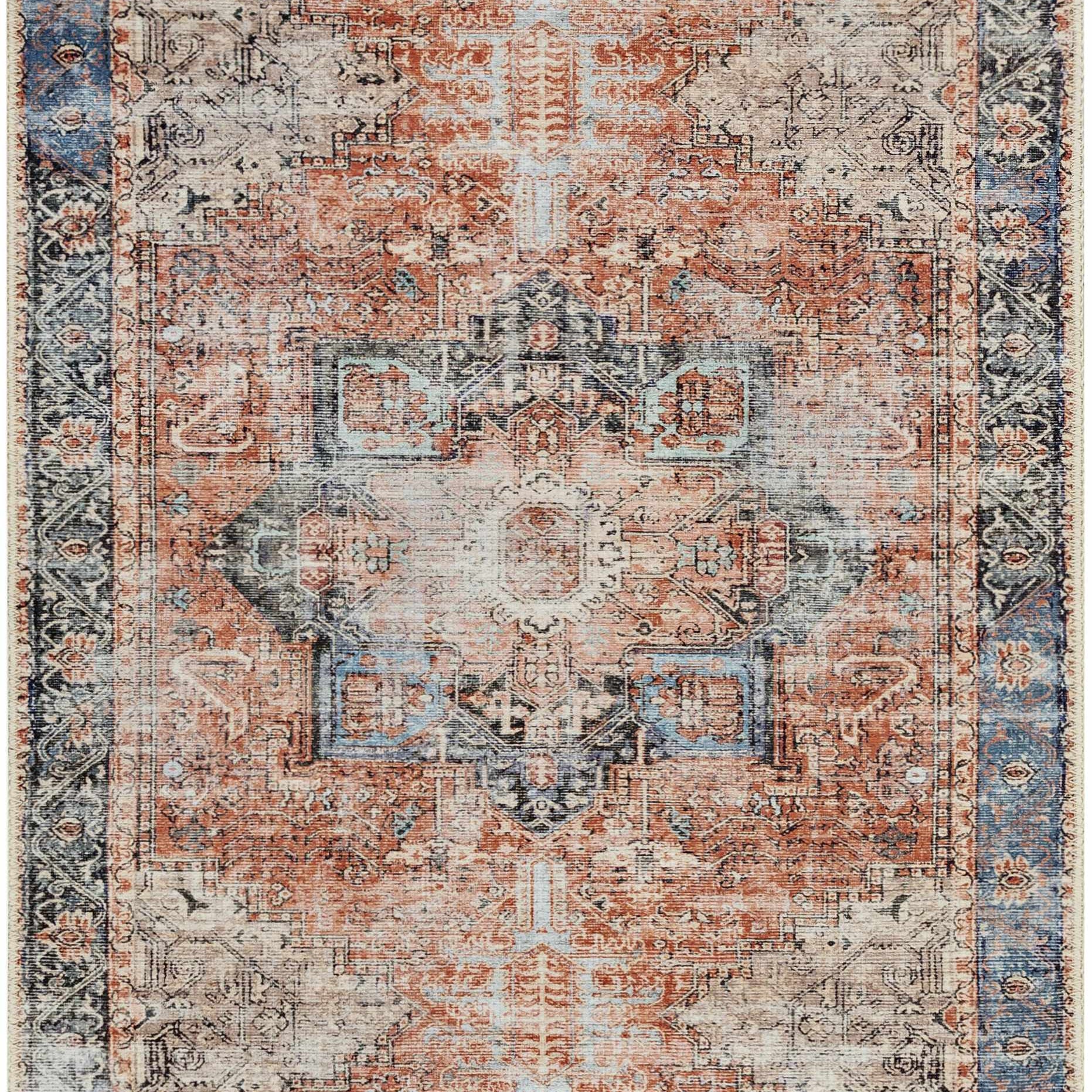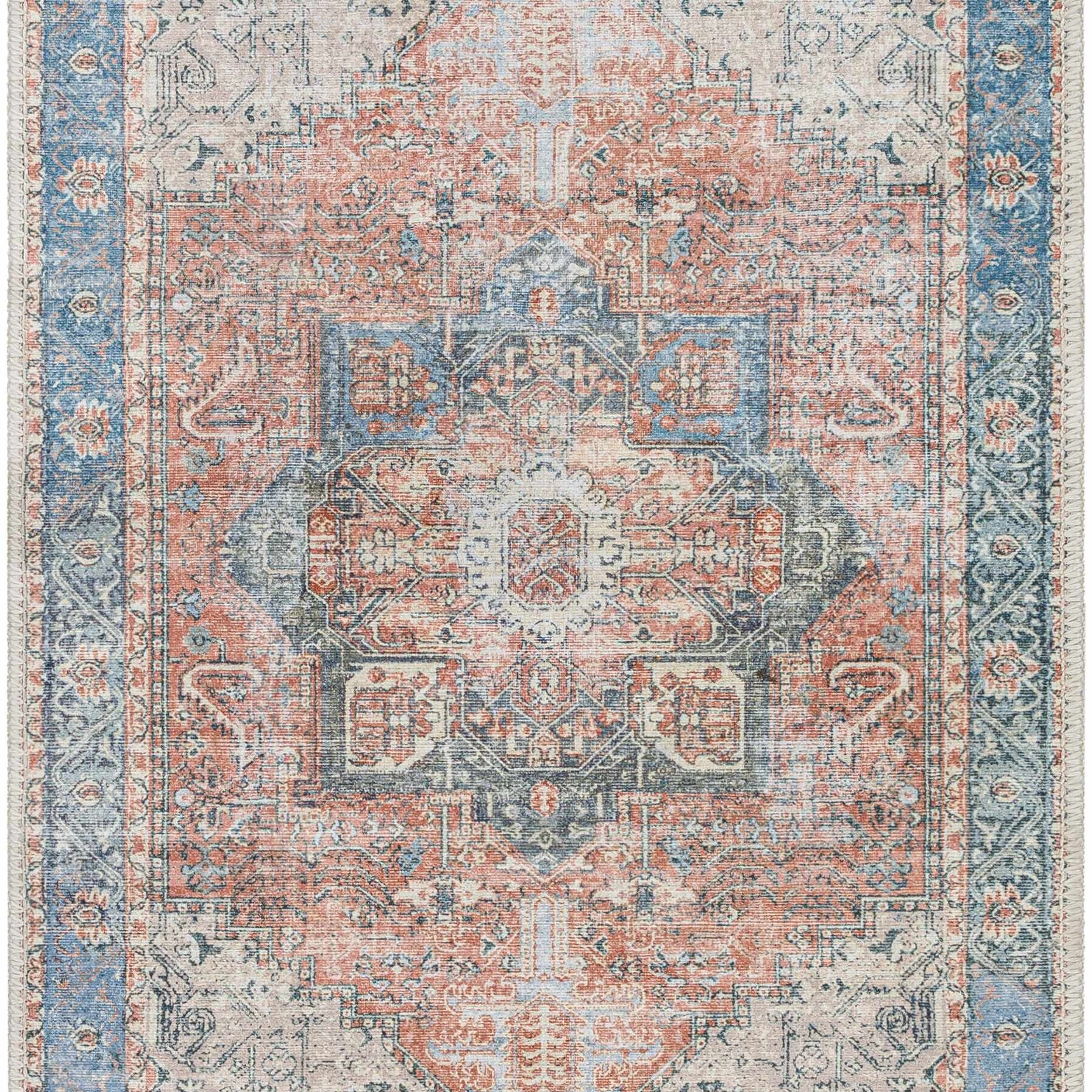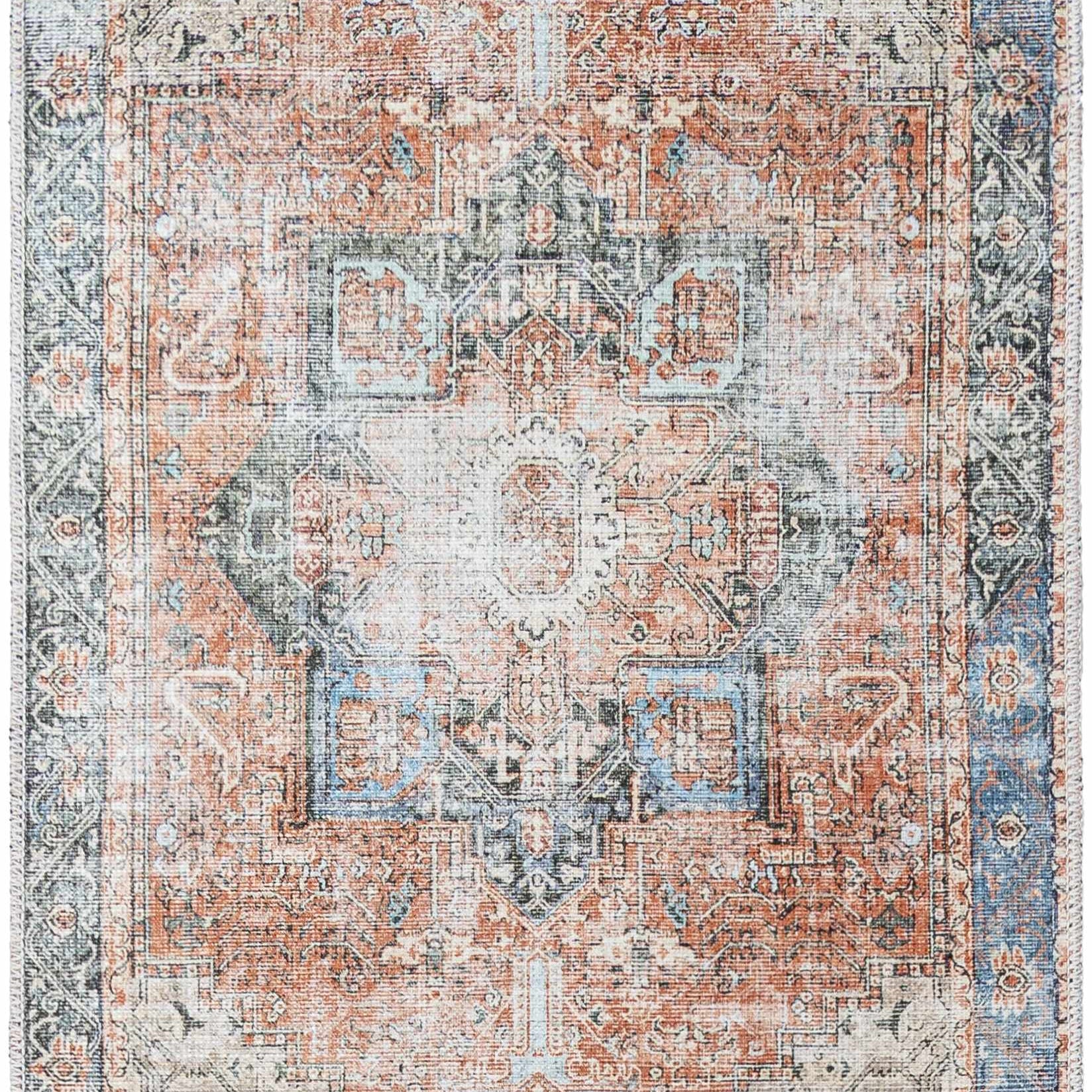 About: The composition of red, orange, and blue has been infused into this astonishing vintage rug to create a pronounced texture in your space. Besides the rich color palette, its pet-friendly and washable structure will please you more than ever.